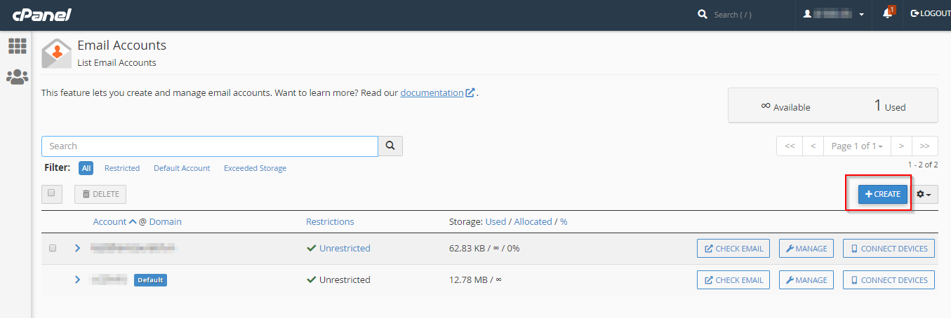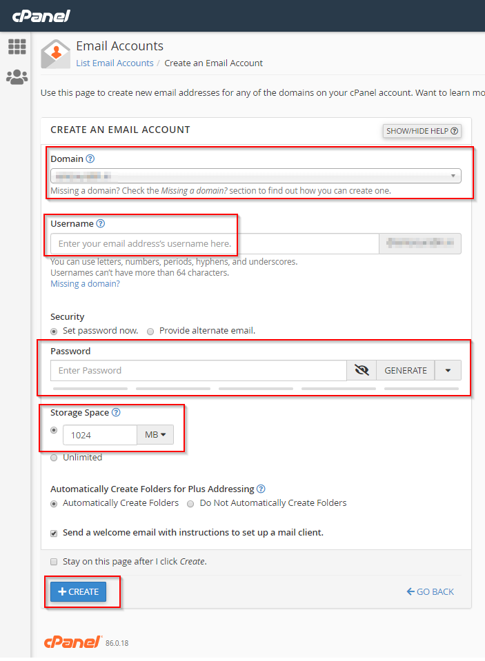 4. Fill the details and click on create to create email account. Once email account is created, you can access it using webmail(dot)yourdomain(dot)com